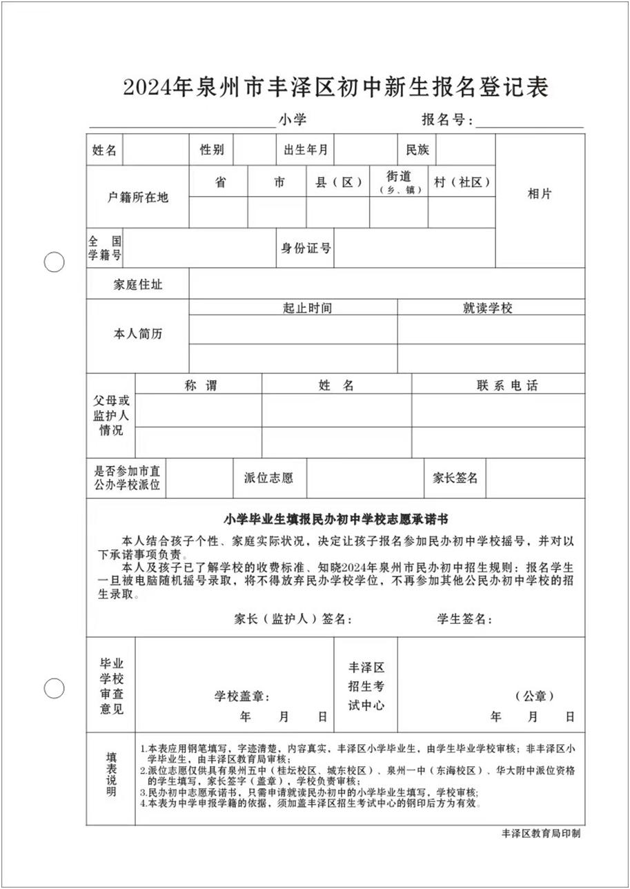 泉州市公(民)办初中招生捆绑电脑派位申请表