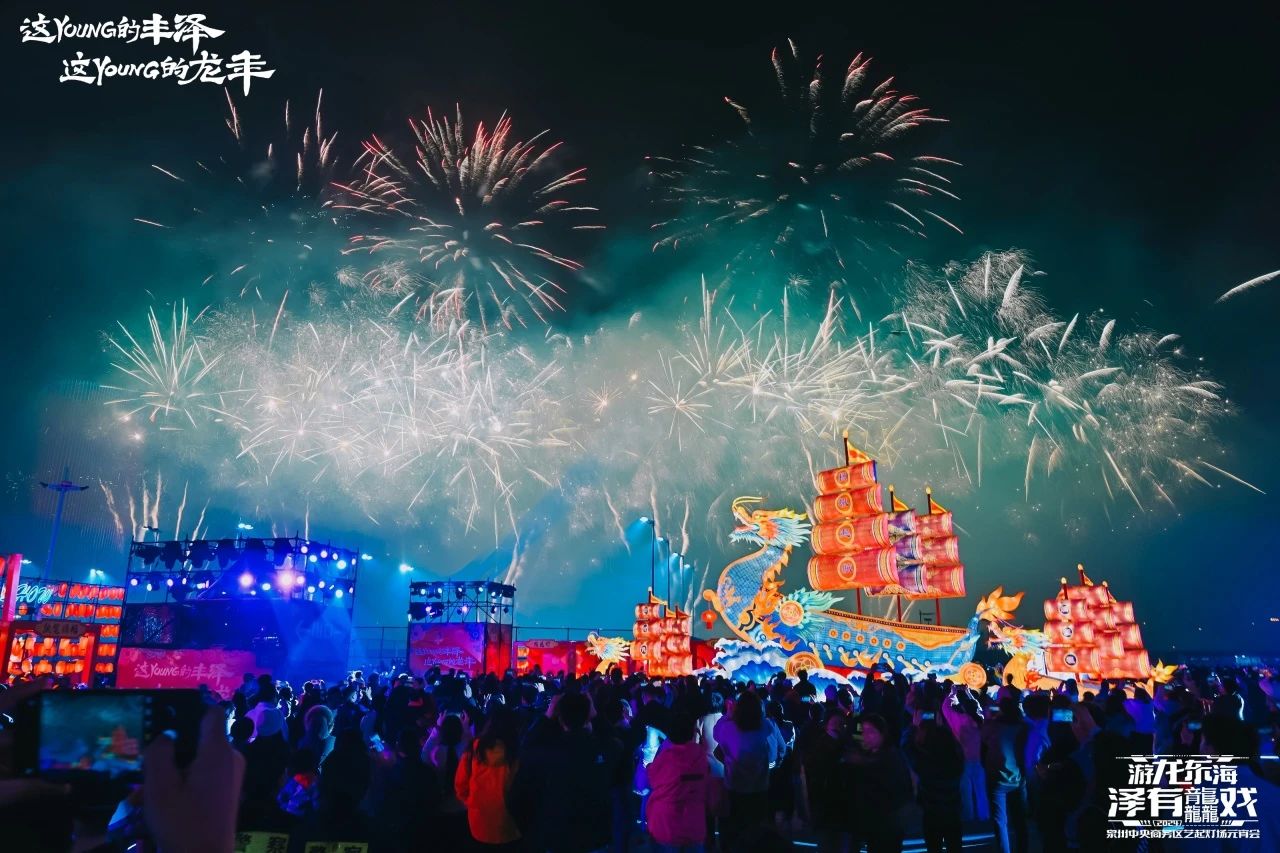 一瞬间,十几组龙年主题花灯,从中心的「龙船花灯」向四周逐渐点亮延伸,气氛被拉到最高潮。众多市民和游客来到现场,见证这纪念性的一刻,还有烟花大秀、国风市集、全息幻城剧场、朋克舞狮和游园演绎活动持续上演。