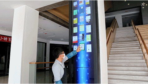 来到图书馆正大门,映入眼帘的台阶两侧、两根柱状屏幕上,各类电子书如瀑布般向下滑落。走上一楼台阶,来到二楼中庭,抬头迎面而来的是一幅三层楼高的“素馨花开”主题壁画 。