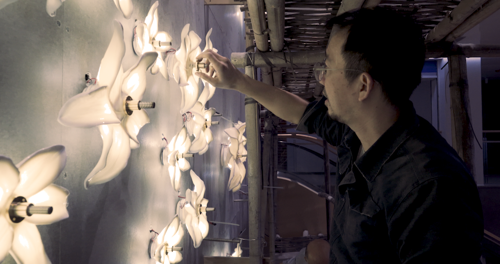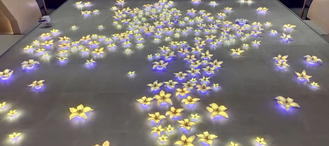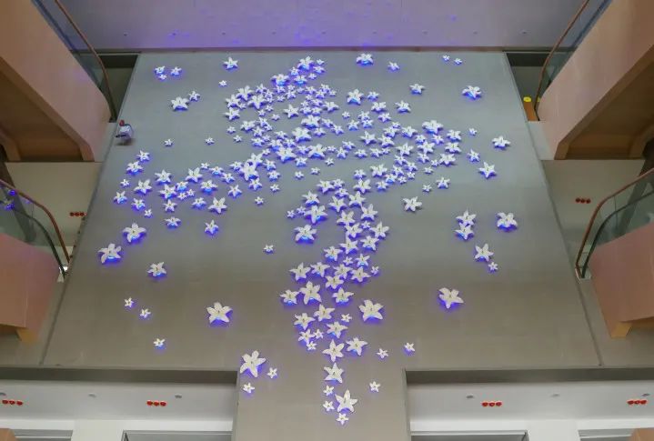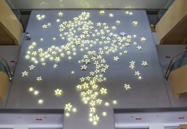 该壁画由当代艺术家吴达新先生创作,灵感来源于蟳埔女头上的簪花围,采用“白瓷+现代灯光”工艺制作。千朵“素馨花”在灯带的映衬下显得更加的典雅庄重。