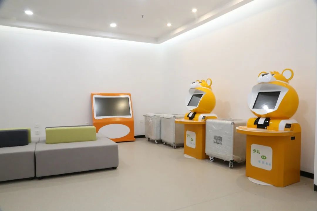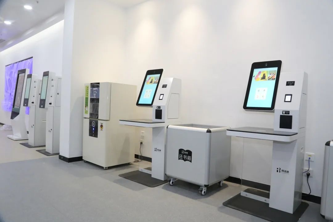 各式先进的还书、办卡设备,方便群众自主办理,针对儿童,还特别设置了卡通风格的还书设备。