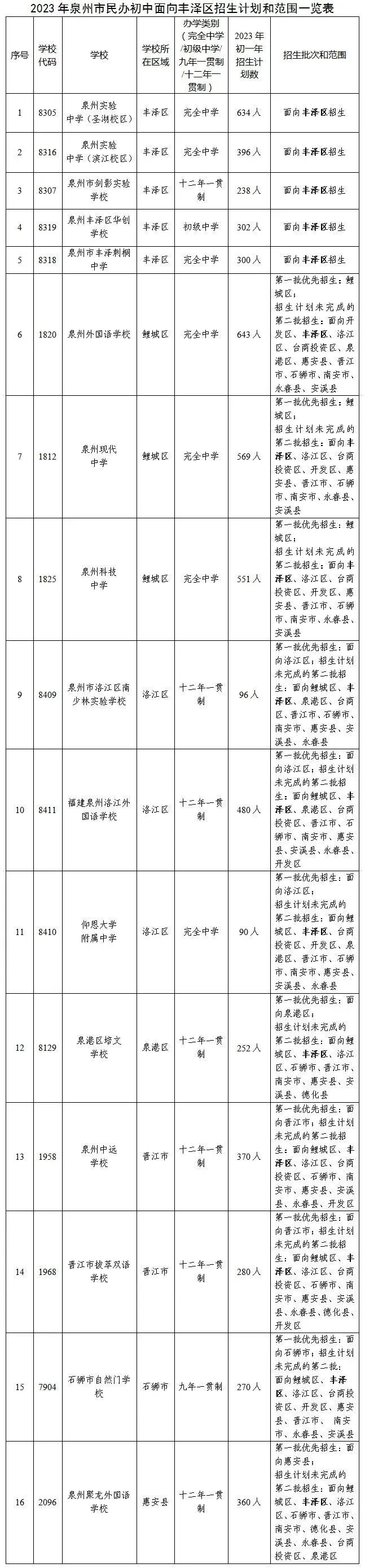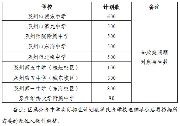 5.7月11日至12日,申请就读区属公办初中的随迁子女(扣除已被民办初中及市直公办初中电脑派位录取的),丰泽辖区小学毕业生的按毕业小学(非丰泽辖区小学毕业生的按居住证)所属街道到以下指定的片区公办中学审核。